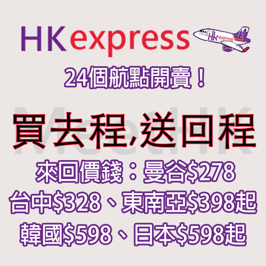 買去程,回程$0!24個航點都有優惠!香港飛曼谷來回只需$278、台中$328、東南亞$398起、韓國$598、日本$598起 – HK Express (優惠至4月28日)