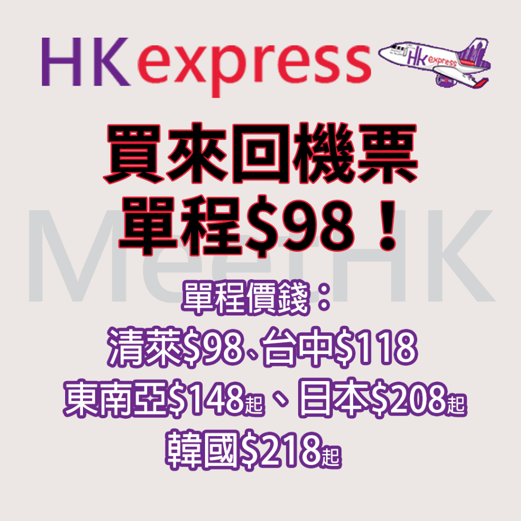 買來回機票單程低至$98!全線航點開賣!新增40kg巨大寄艙行李供選購!想大手掃貨都得!香港飛清萊單程只需$98、台中$118、東南亞$148起、日本$208起、韓國$248 – HK Express (優惠至5月19日)