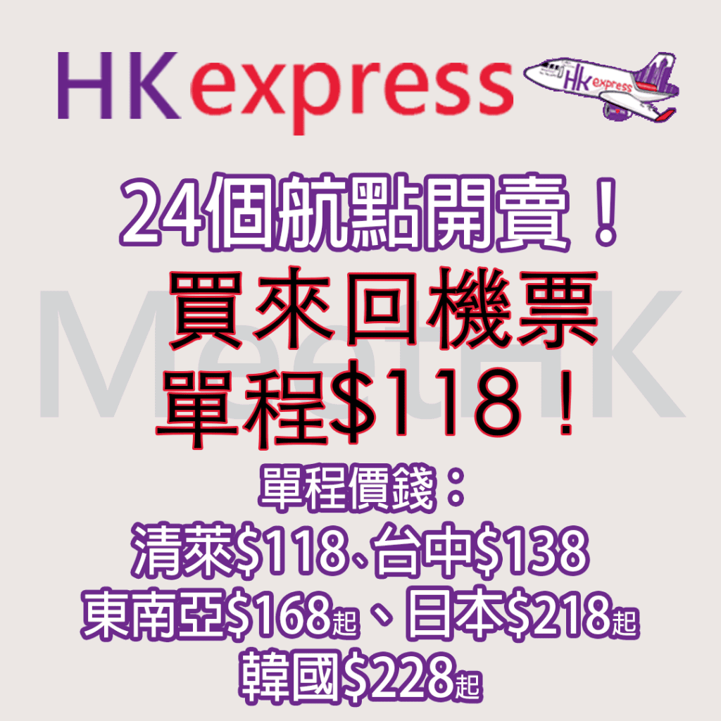 買來回機票單程低至$118!24個航點開賣!香港飛東南亞單程只需$118起、台中$138、日本$218起、韓國$228起 – HK Express (優惠至5月5日)