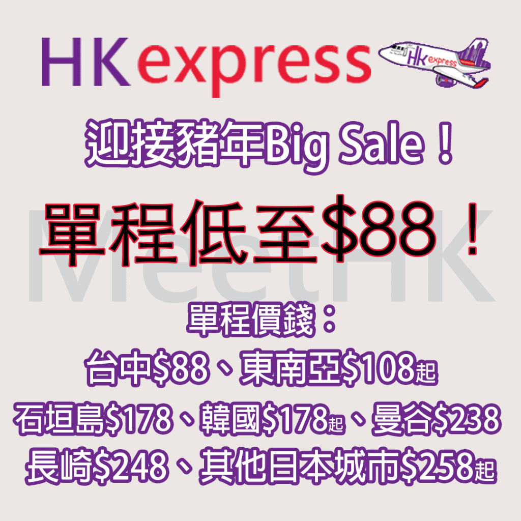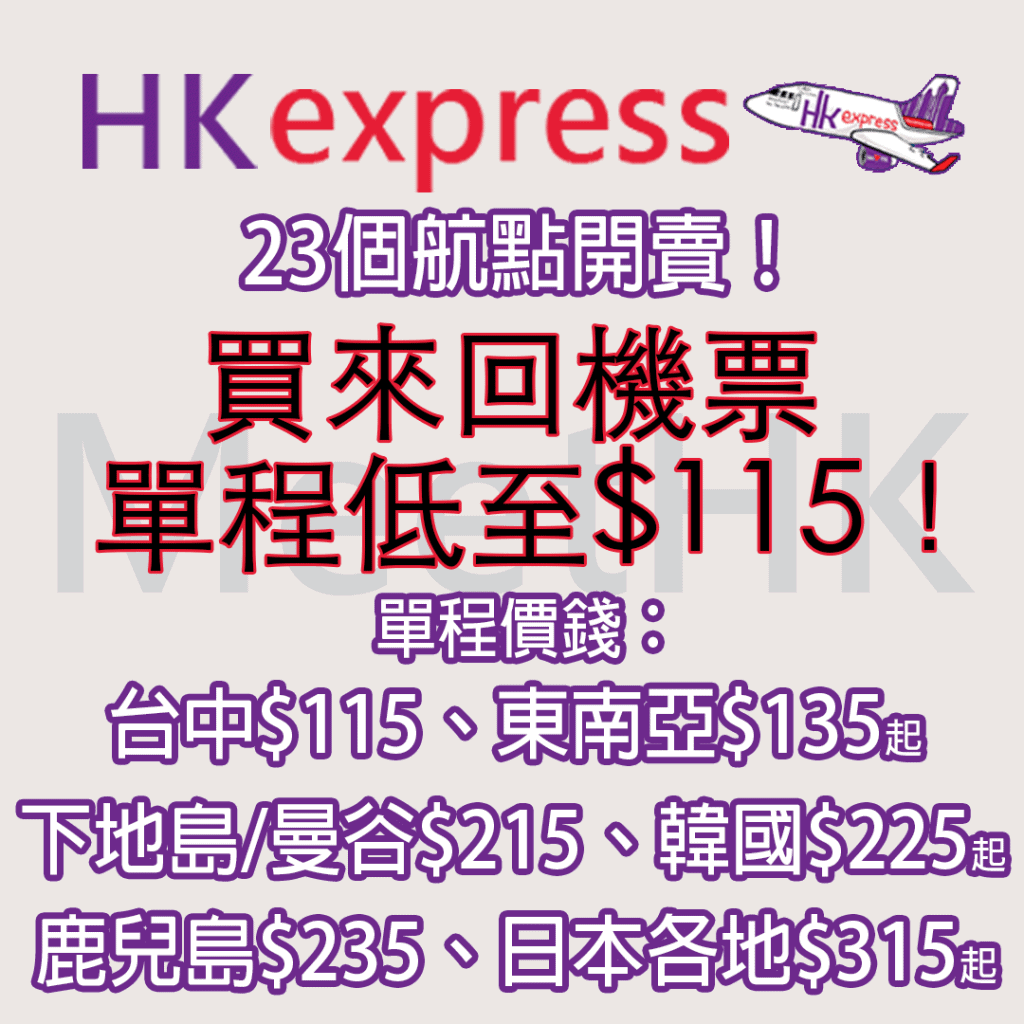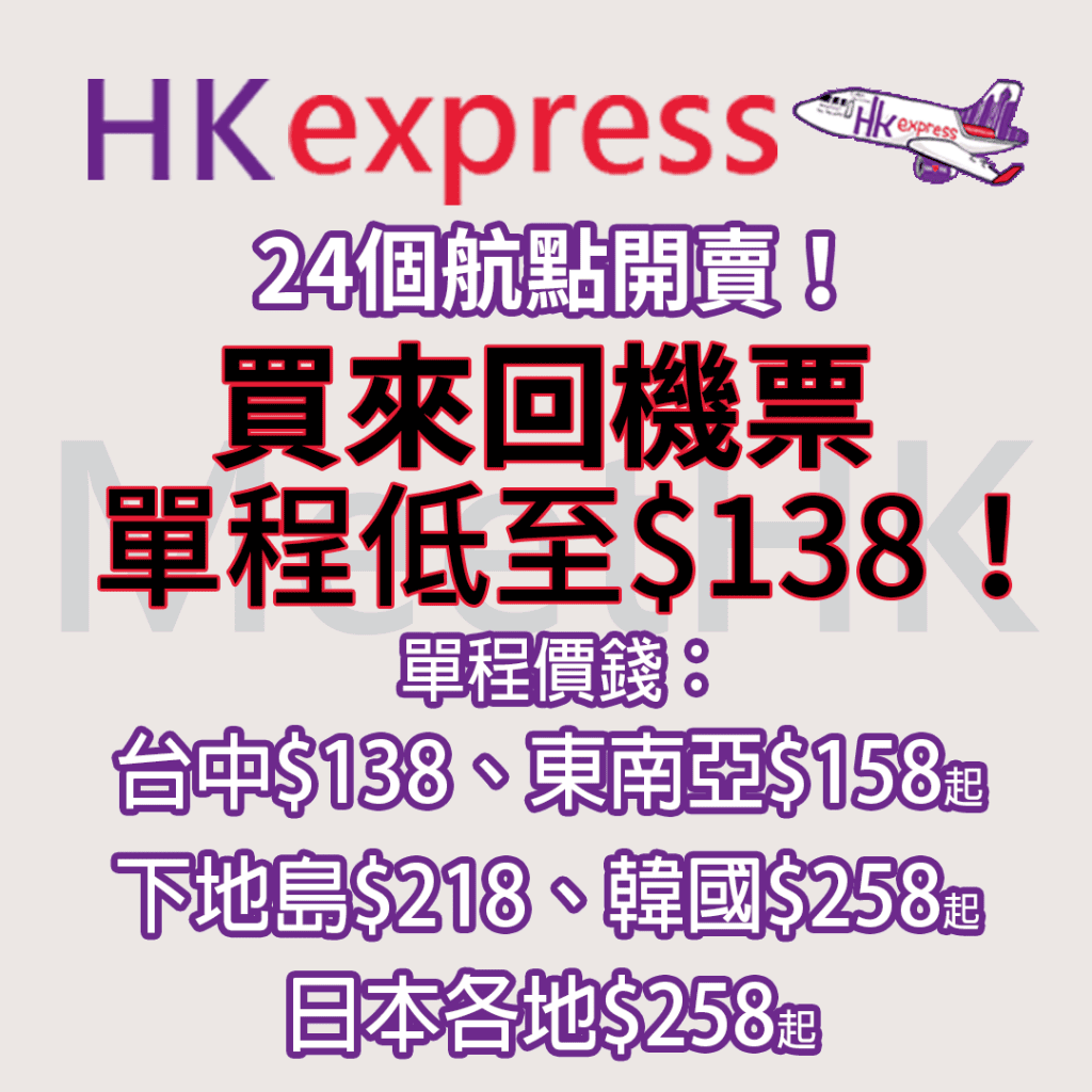 買來回機票單程低至$118!24個航點開賣!香港飛台中單程只需$118、東南亞$138起、韓國$228起、日本各地$218起 – HK Express (優惠至3月24日)