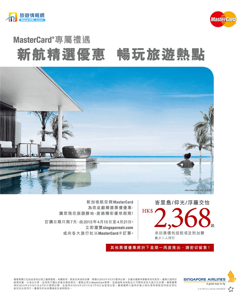 由上星期開始,新航同MasterCard連續4個星期推出唔同地方既機票優惠,上星期推出左馬爾代夫優惠