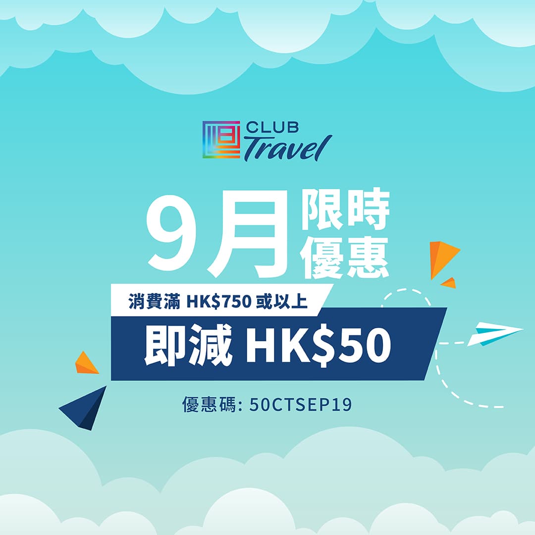 Club Travel推出全線機票滿$750(未連稅),輸入優惠碼:50CTSEP19 即減$50優惠!名額200個咋!唔好錯過!