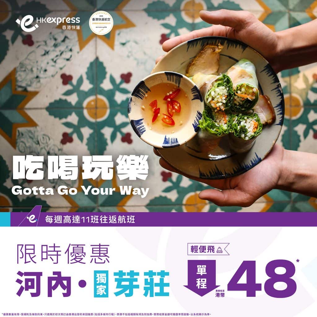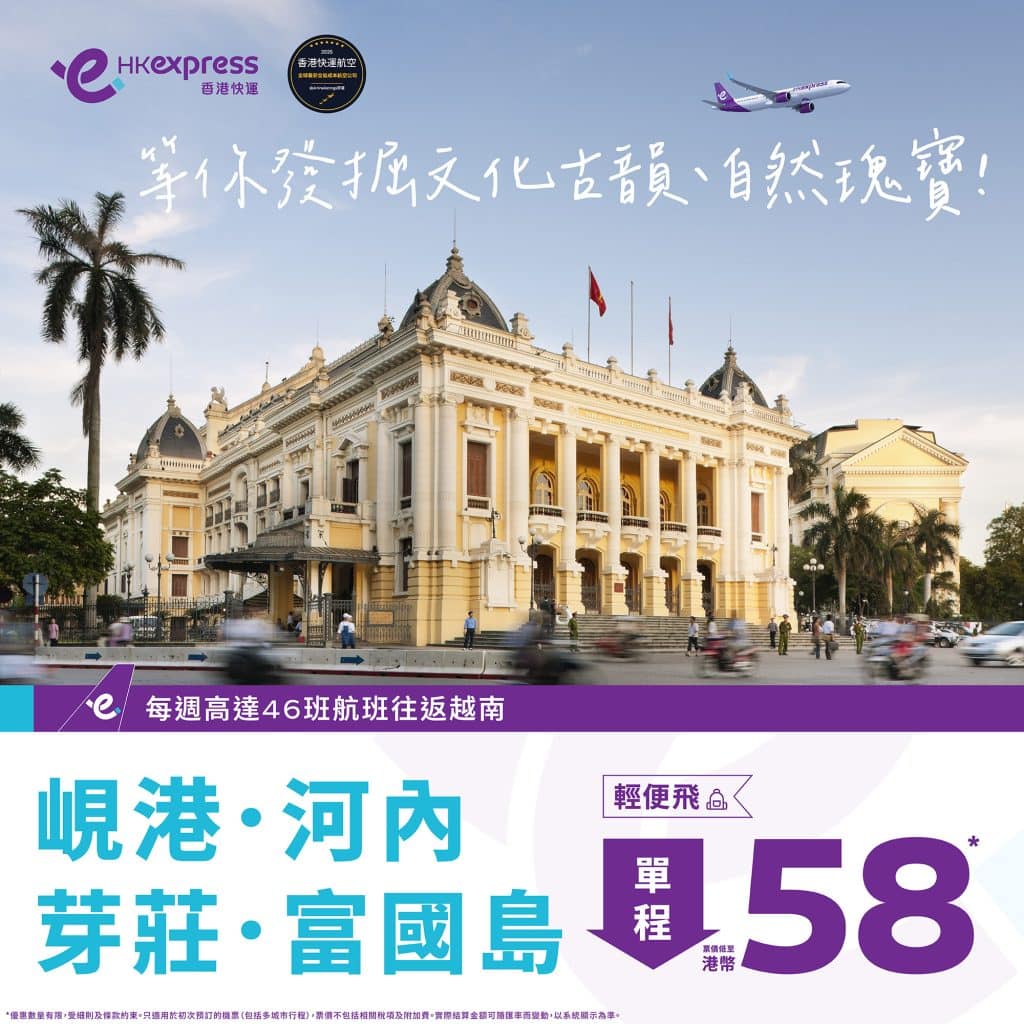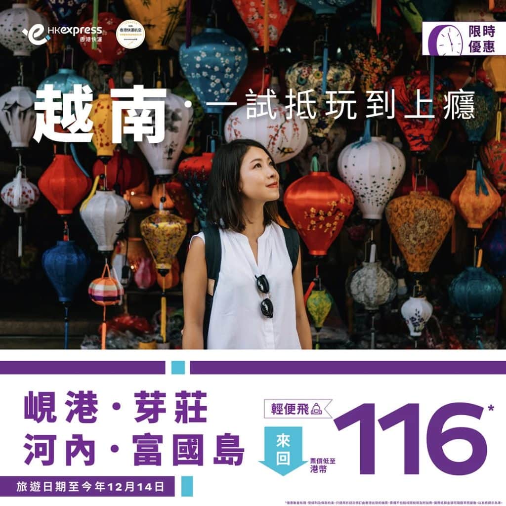 減$120後,香港飛胡志明市來回連稅只需$1,316起、河內$1,364起