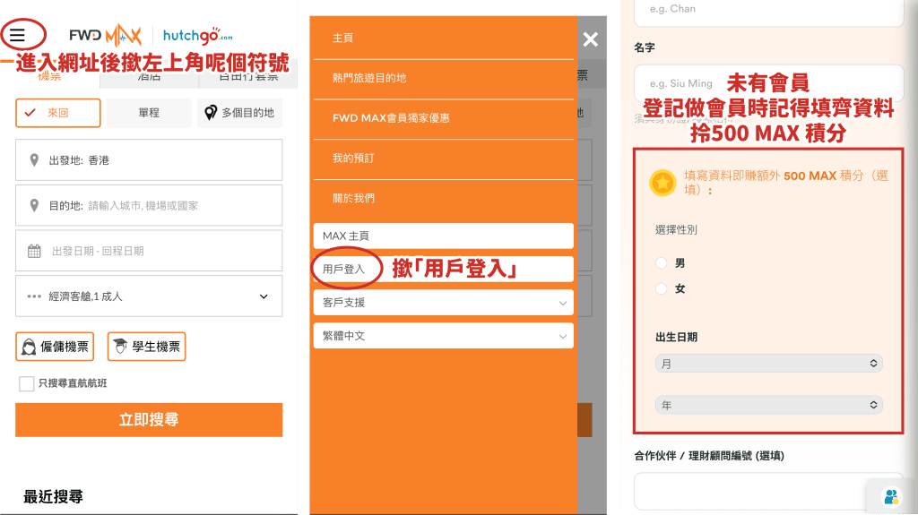 Step 1︰ 於指定活動網站 (https://specialoffer.hkexpress.com/zh-hk)揀選出發地、目的地、出發和回程日期進行航班搜尋。