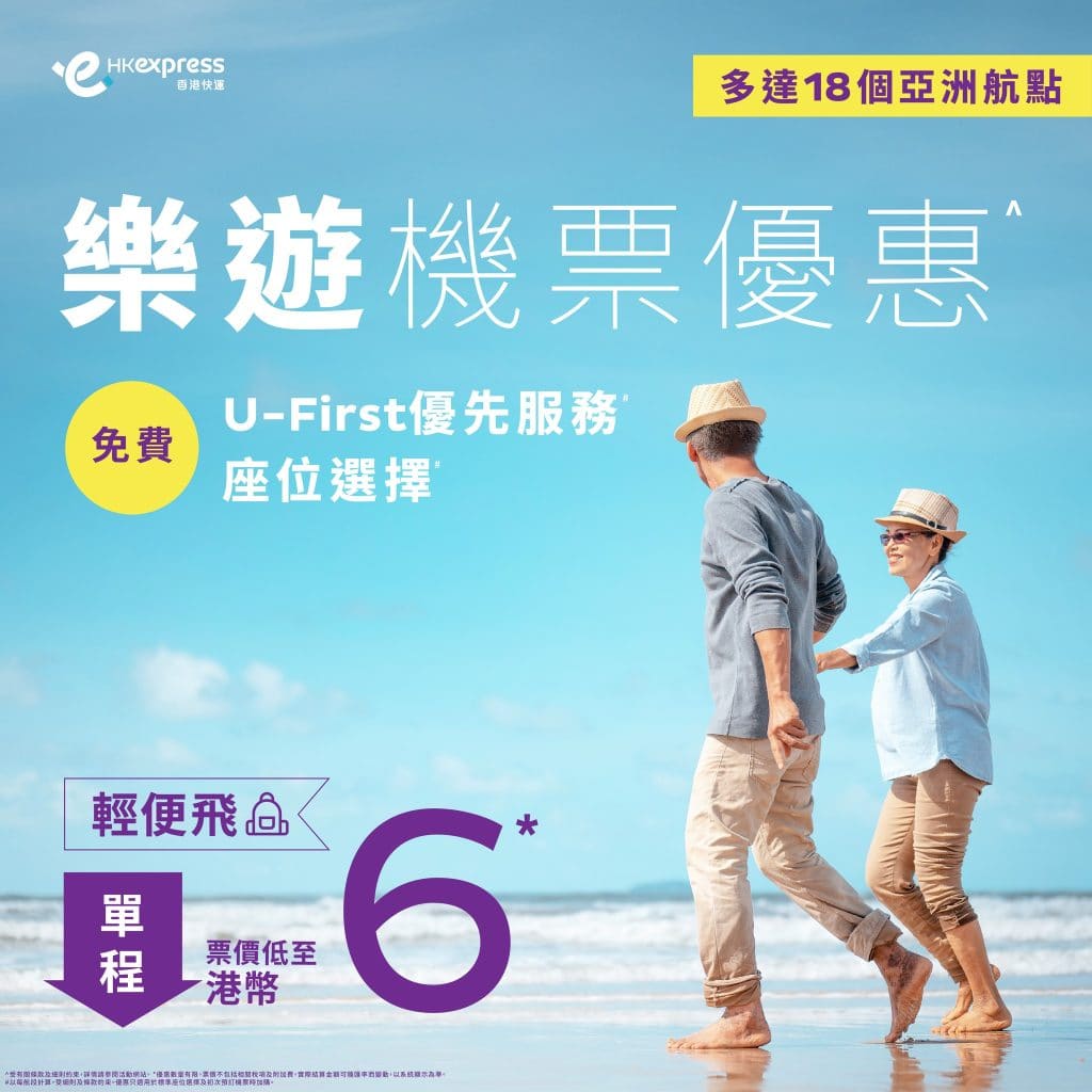 老友記出發啦!HK Express長者專屬優惠!內地越南單程$6起、台灣泰國$36起、韓國$86起、日本$166起!送U-First優先服務+揀位 – HK Express (優惠至8月16日)