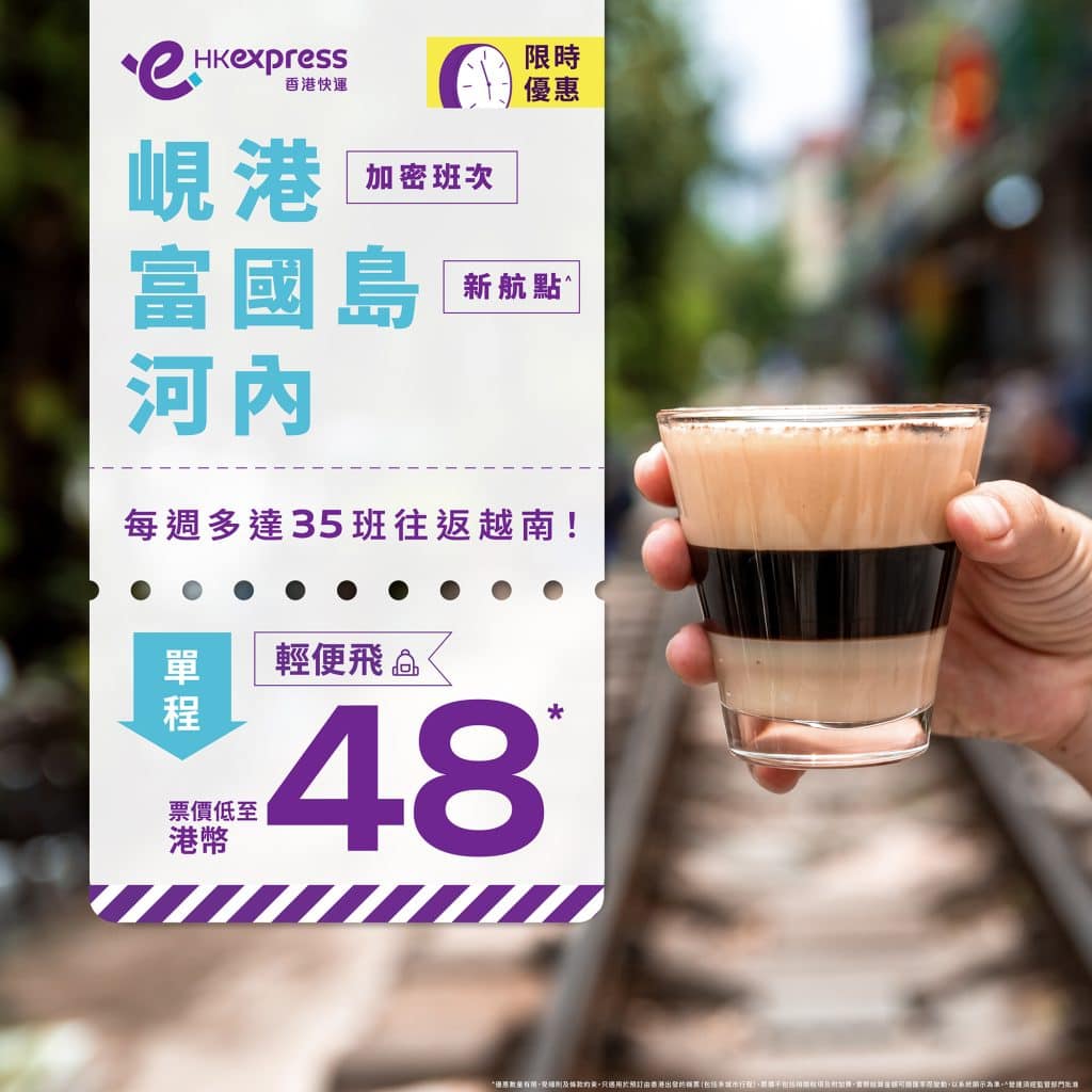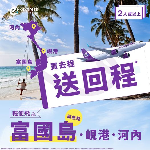 越南限時優惠!買去程,送回程!明年3月29日前出發!香港飛富國島/峴港/河內二人同行來回每人只需$78起 – HK Express (優惠至8月22日)