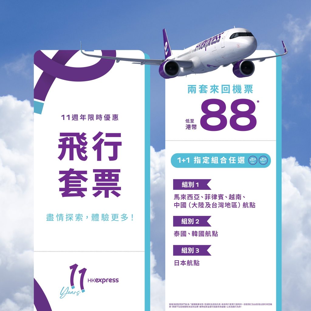 HK Express推出咗11周年限時1+1飛行套票優惠!