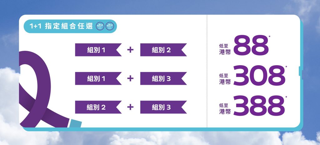 飛行套票總共分3個類別 ***每張飛行套票必須搭配兩個不同的組別***,價錢視乎不同組別: