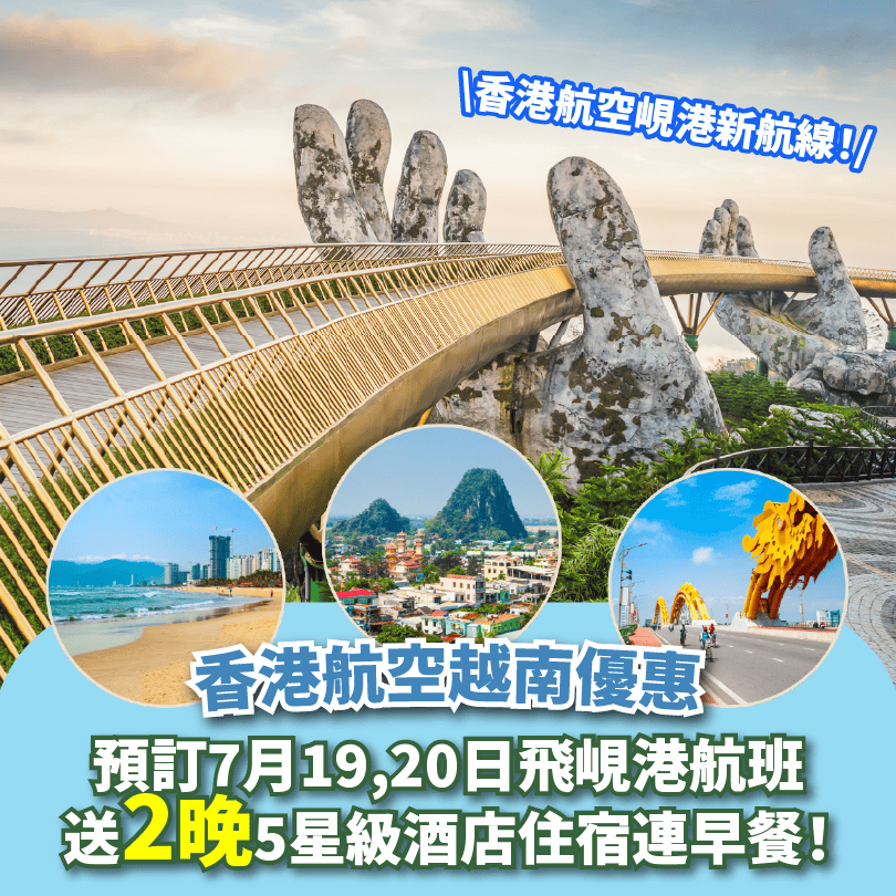 玩轉峴港之旅!香港航空峴港新航線!預訂7月19,20日飛峴港航班送2晚5星級酒店住宿連早餐!