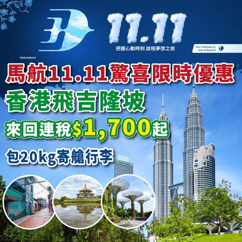 香港飛吉隆坡來回連稅只需$1,700起,包20kg寄艙行李