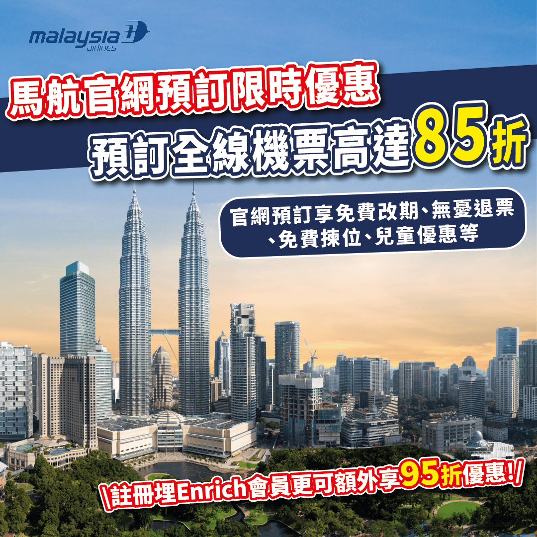 想坐馬航飛長途,今次優惠同樣適用!除咗東南亞短線航點之外,經吉隆坡仲可以延伸轉飛澳洲、新西蘭、倫敦等長途航點,於馬航官網訂票一樣可以享有高達85折,係時候諗諗嚟一轉長旅行喇!
