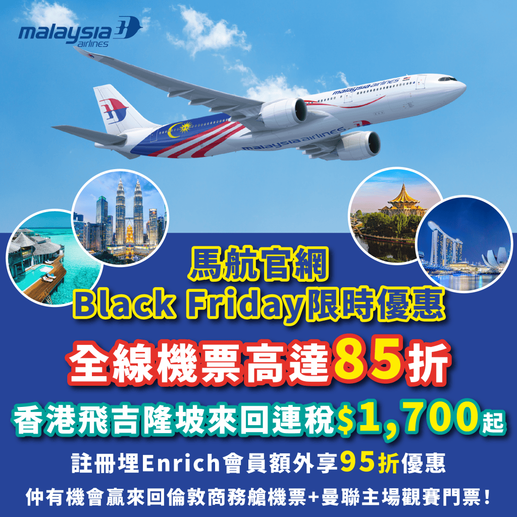 馬來西亞國際航空官網推出咗Black Friday限時高達85折優惠!