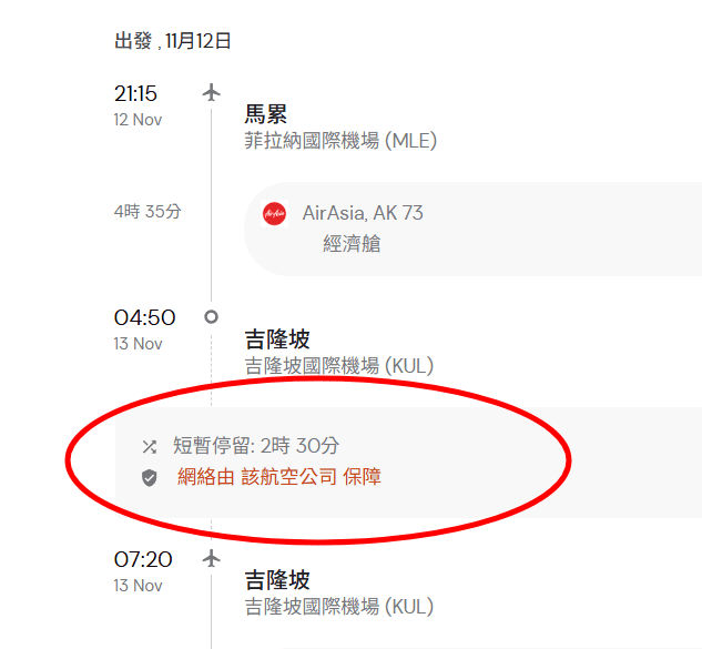 喺搜尋航班時,見到兩程都係AirAsia航班而且顯示「短暫停留:網絡由 該航空公司 保障」就代表包咗Fly-Thru轉接(中轉聯程)服務!