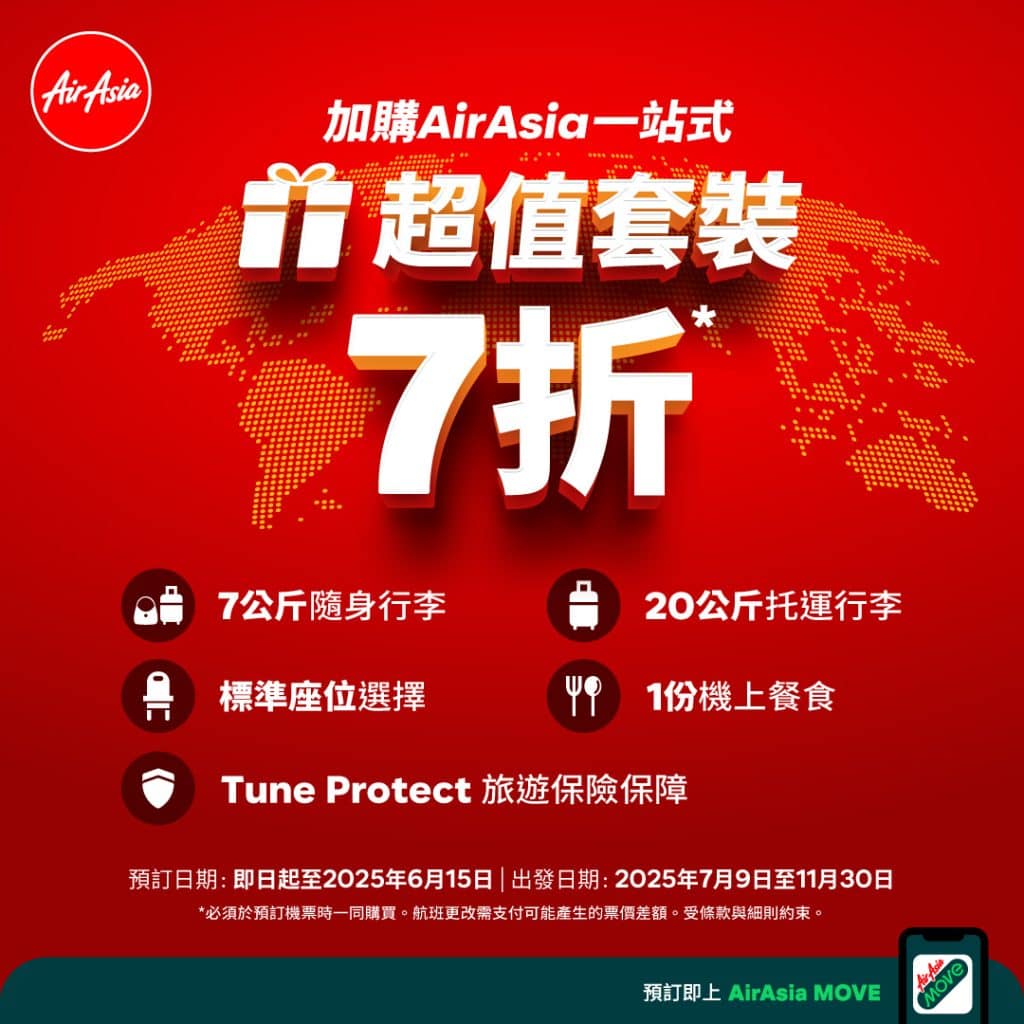 依家喺AirAsia官網預訂機票時同時加購埋Value Pack(超值套裝)更可享7折優惠!Value Pack包咗20kg寄艙行李、餐飲、揀位、Tune Protect旅遊保險保障!