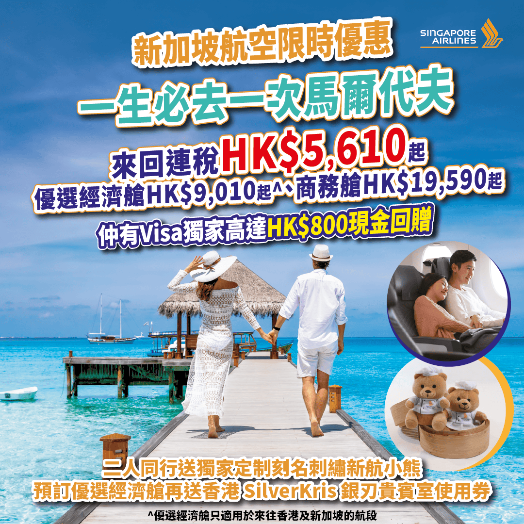 終於等到啦!新航限時暑假早鳥優惠!11月30日前出發!香港飛新加坡來回連稅HK$2,205起、峇里島HK$2,810起、澳洲各地HK$4,340起、馬爾代夫HK$5,595起!仲有Visa獨家高達HK$800現金回贈!