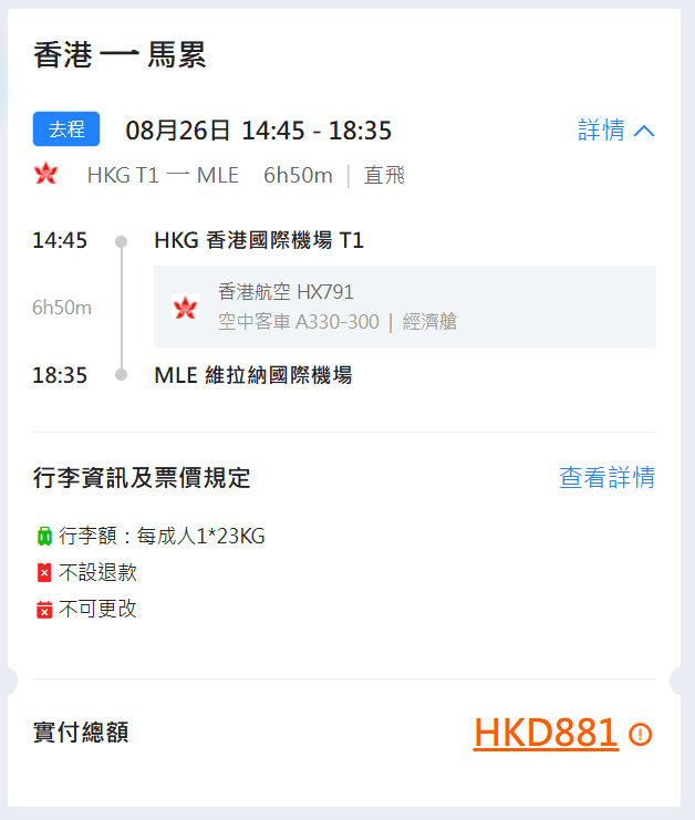香港飛珀斯來回連稅$2,188起、馬爾代夫$2,699