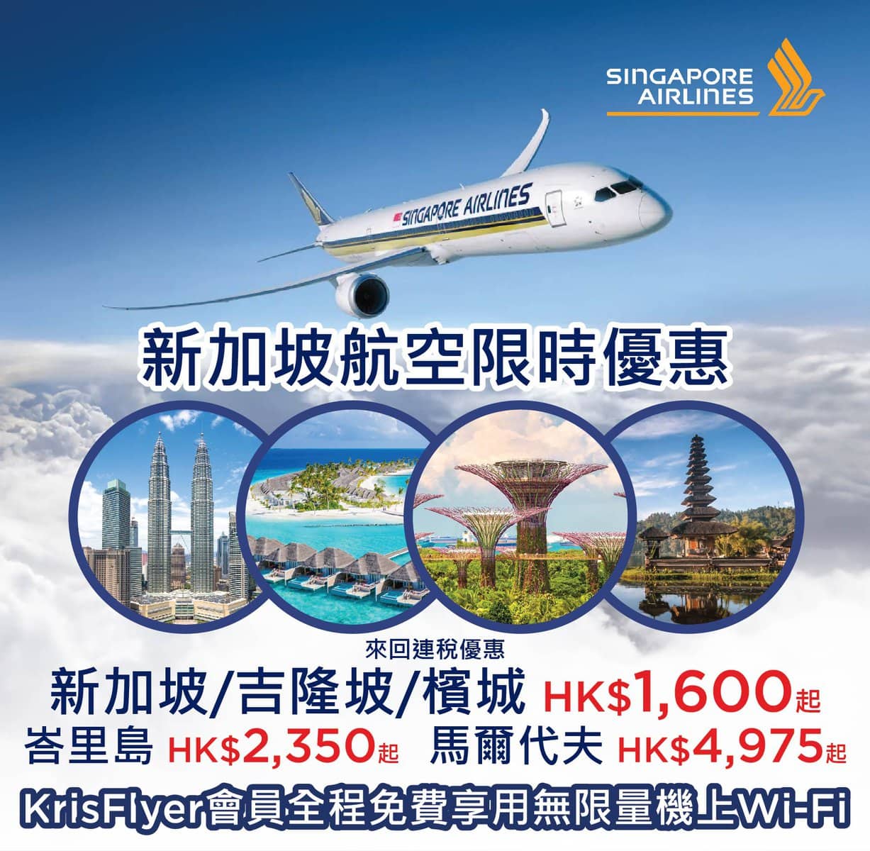 新加坡航空限時優惠!飛新加坡連稅千八起!暑假旺季都有!香港飛新加坡/吉隆坡/檳城來回連稅只需HK$1,805起、澳洲各地HK$4,050起、馬爾代夫HK$5,045起!KrisFlyer會員額外禮遇(新幣30元KrisShop 電子禮券)+全程無限量免費享用機上Wi-Fi!