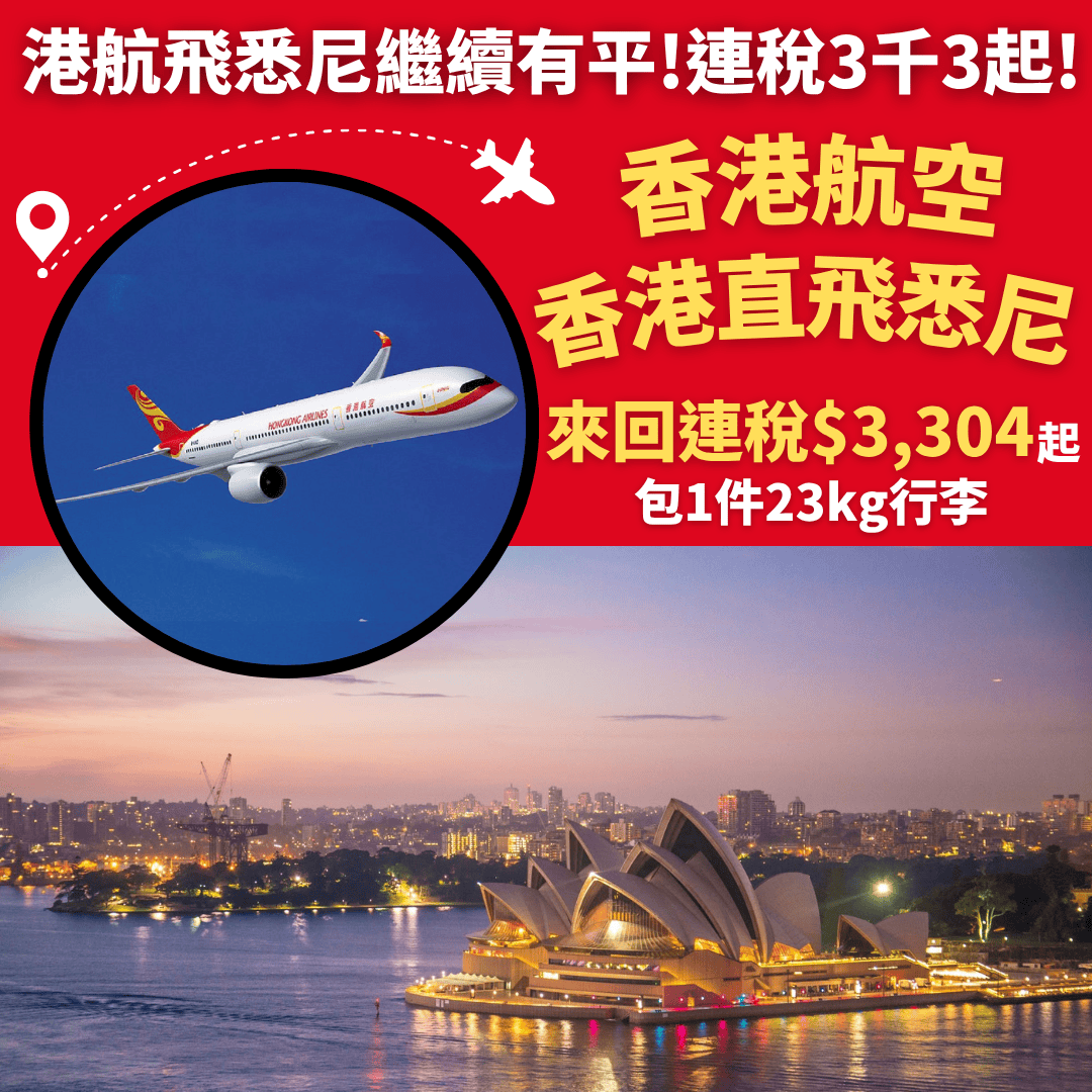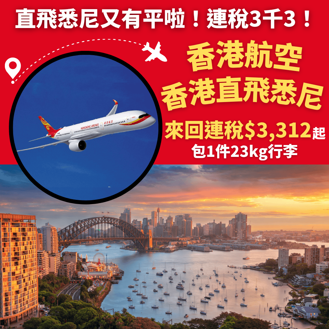 直飛悉尼又有平啦!連稅3千3!包23kg寄艙行李!11月23日前出發!香港直飛悉尼來回連稅只需$3,312起 – 香港航空