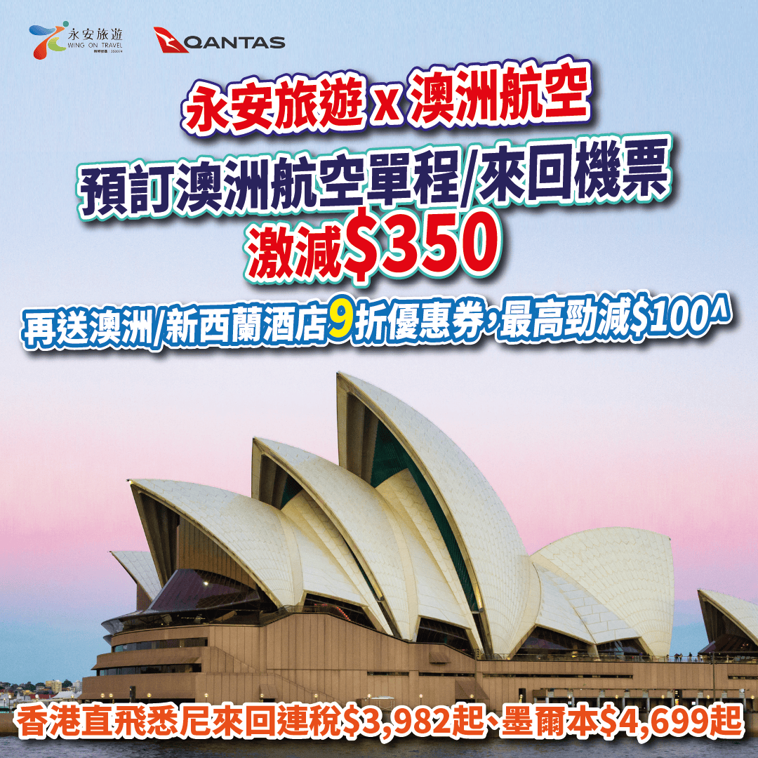 【永安旅遊 x 澳洲航空】送澳洲/新西蘭酒店9折優惠券,最高勁減$100^!