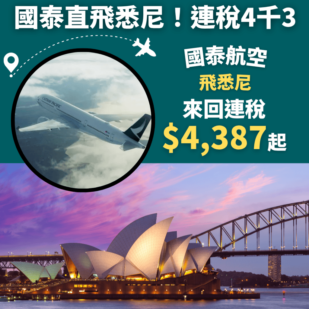 國泰直飛悉尼!連稅4千3!明年3月26日前出發!香港飛悉尼來回連稅只需$4,387起 – 國泰航空 (優惠至9月11日)