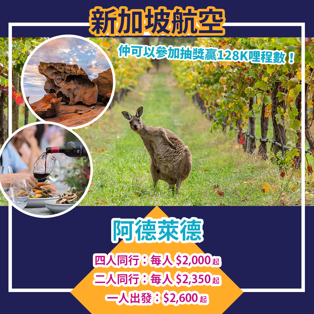 澳洲各地:墨爾本HK$4,340起、悉尼HK$4,415起、布里斯班HK$4,565起、珀斯/凱恩斯HK$4,760、達爾文HK$4,955起、阿得雷德HK$5,025
