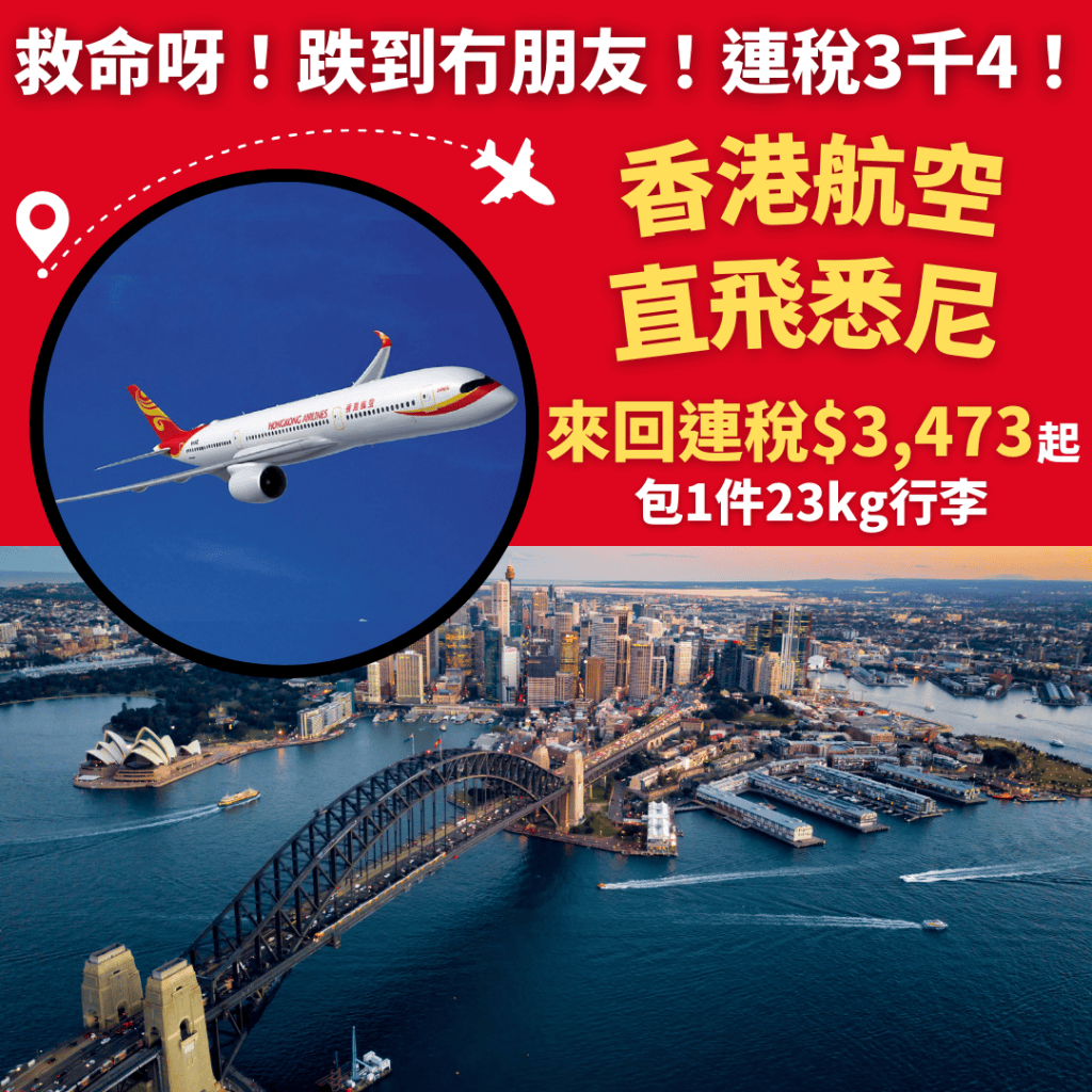 救命呀!悉尼減到冇朋友!連稅3千4!暑假出發都有!10月24日前出發!香港直飛悉尼來回連稅只需$3,473起 – 香港航空 (優惠至4月30日)