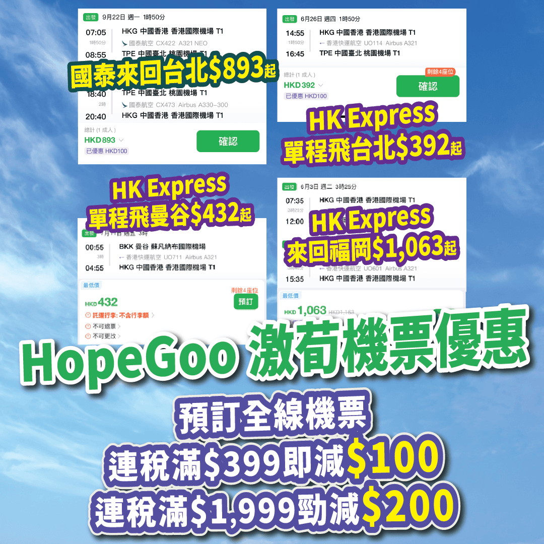 於HopeGoo預訂全線機票輸入MeetHK專屬優惠碼最高勁減$200!依家仲有機場快線半價!