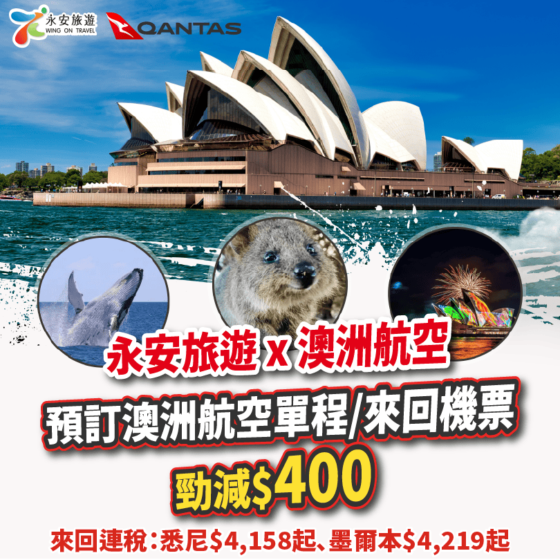 永安旅遊 x 澳洲航空推出咗澳洲機票每單激減$400優惠!
