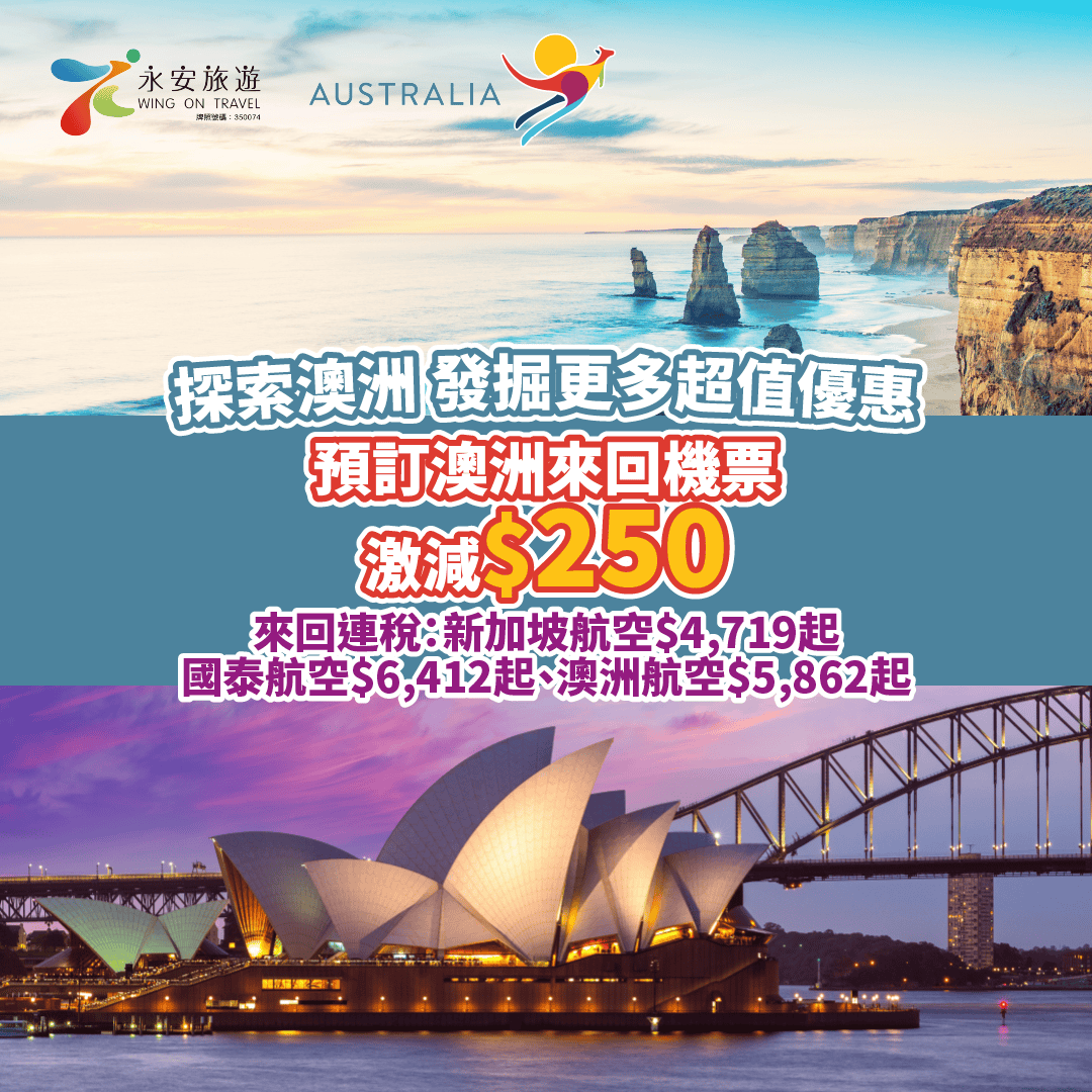 【永安旅遊 x 澳洲旅遊局】預訂澳洲來回機票激減$250!