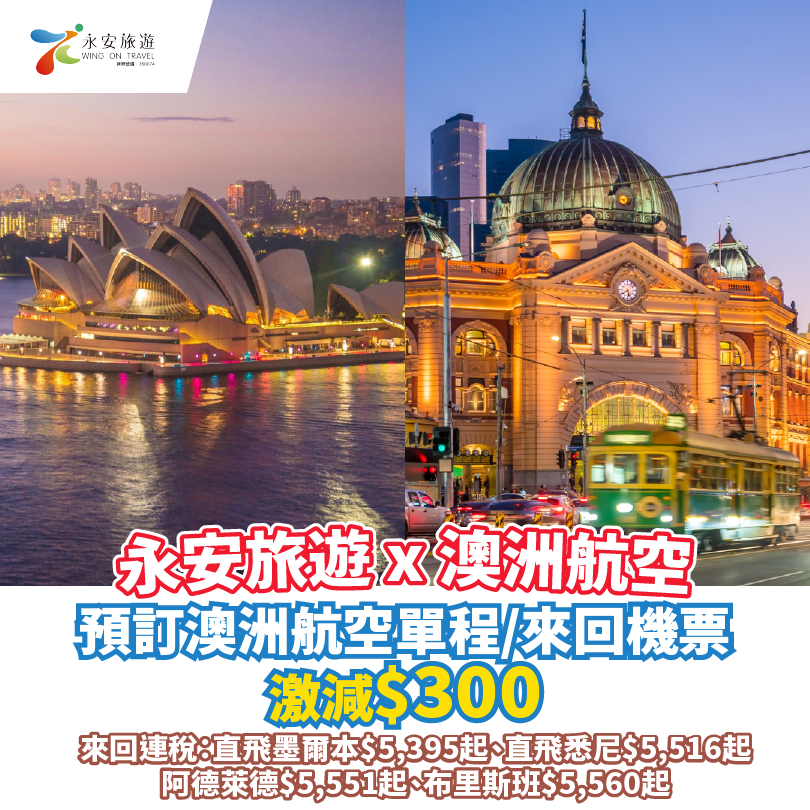 【永安旅遊 x 澳洲航空】最後召集!預訂澳洲航空單程/來回機票激減$300!香港直飛悉尼、墨爾本來回連稅只需$5,395起