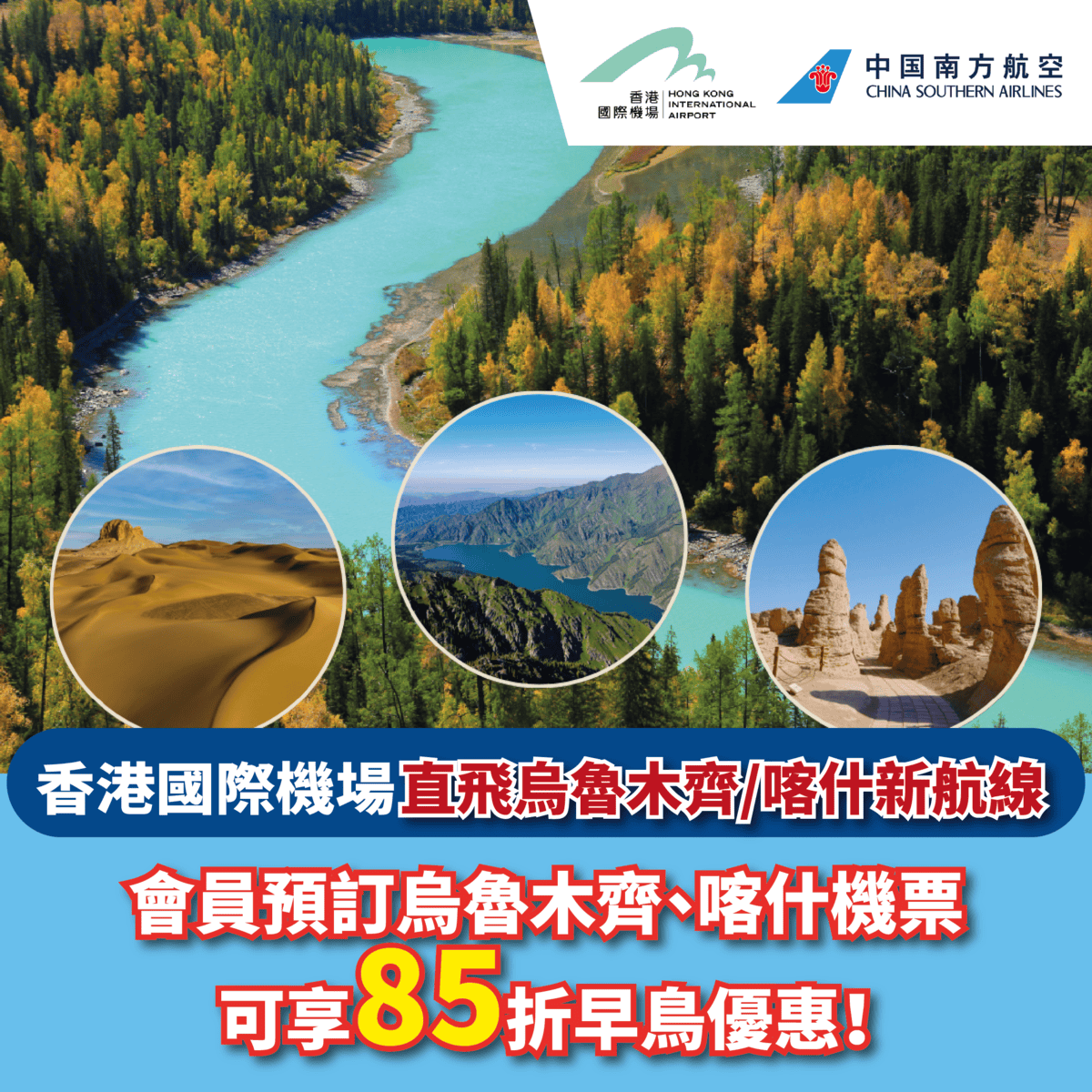 【直飛烏魯木齊/喀什】中國南方航空新航線!賞北疆遊南疆!會員預訂可享85折早鳥優惠!香港國際機場新推尊尚購物服務!