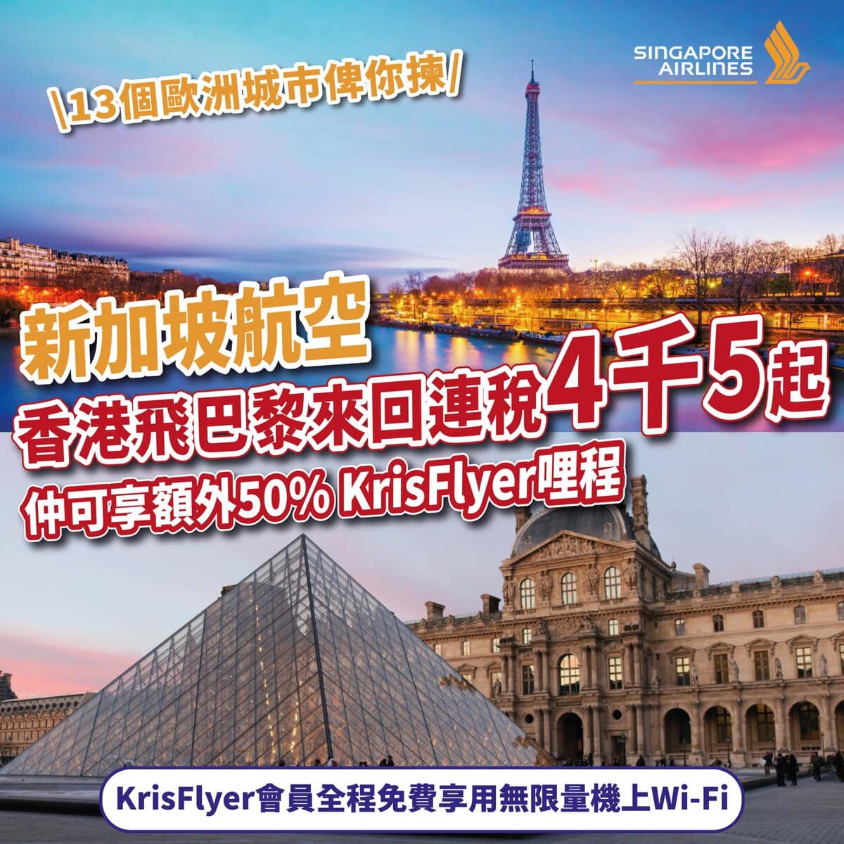 抵呀!連稅4千5起飛巴黎!新加坡航空歐洲浪漫之旅!13個歐洲城市俾你揀!仲可享額外50% KrisFlyer哩程!會員全程無限量免費享用機上Wi-Fi!