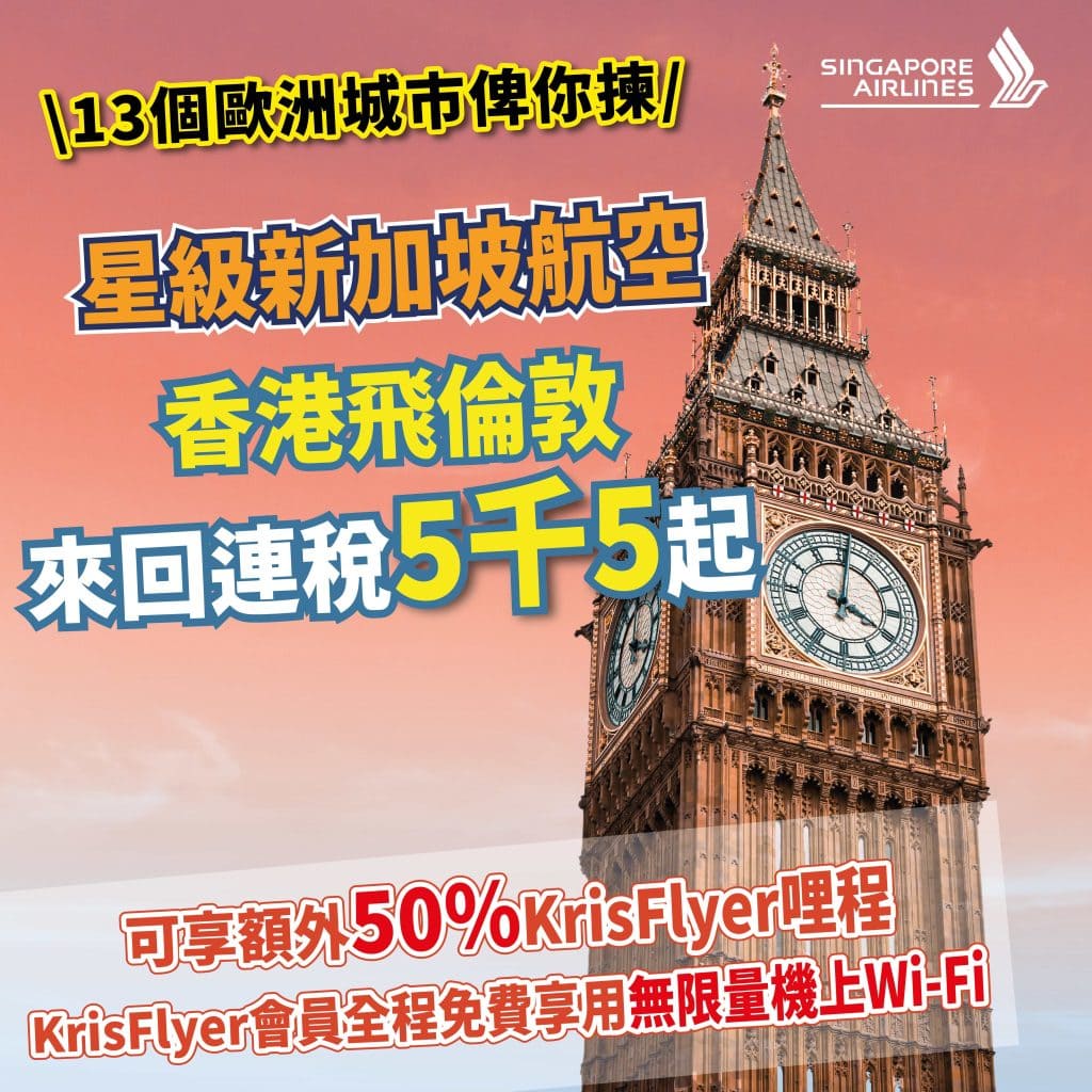 想一家大細/同朋友齊齊出發?新航仲有四人同行優惠!預訂4張或以上從香港出發飛往歐洲機票,指定艙等可享高達九折優惠!香港飛倫敦四人同行來回連稅每人$4,911起!(詳情:https://www.singaporeair.com/zh_TW/hk/plan-travel/local-promotions/gv4/)