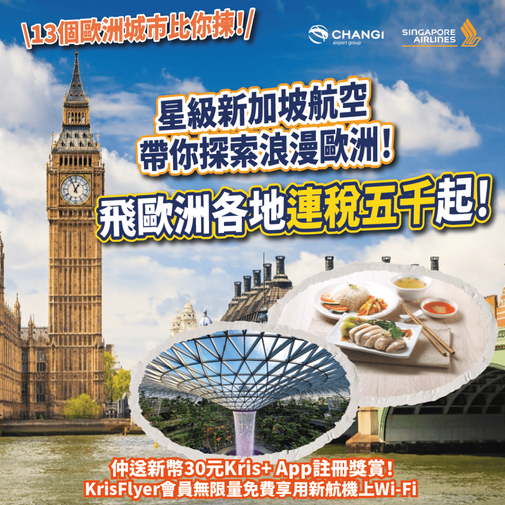 新加坡航空帶你探索浪漫歐洲!飛歐洲各地連稅5千起!再送新幣30元Kris+ App獎賞!KrisFlyer會員全程無限量免費享用機上Wi-Fi (優惠至2月15日)