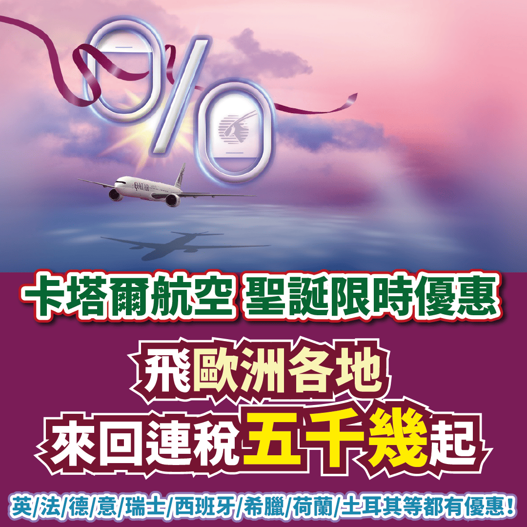 【卡塔爾航空聖誕限時優惠】飛歐洲各地來回連稅五千幾起!杜拜來回連稅$4,617起!英/法/德/意/瑞士/西班牙/希臘/荷蘭/土耳其等35航點都有優惠!可open jaw!(優惠至12月26日)