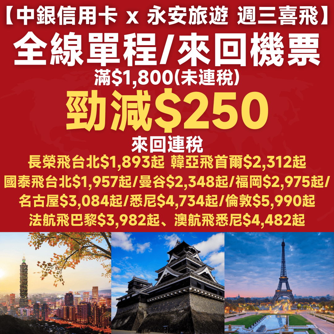 【中銀信用卡 x 永安旅遊 週三喜飛】嘩!今次係全線航點都減!全線機票滿$1,800勁減$250!來回連稅:長榮飛台北$1,893起、國泰飛台北$1,957起/曼谷$2,348起/福岡$2,975起/名古屋$3,084起/悉尼$4,734起/倫敦$5,990起、韓亞飛首爾$2,278起、法航飛巴黎$3,982起、澳航飛悉尼$4,482起