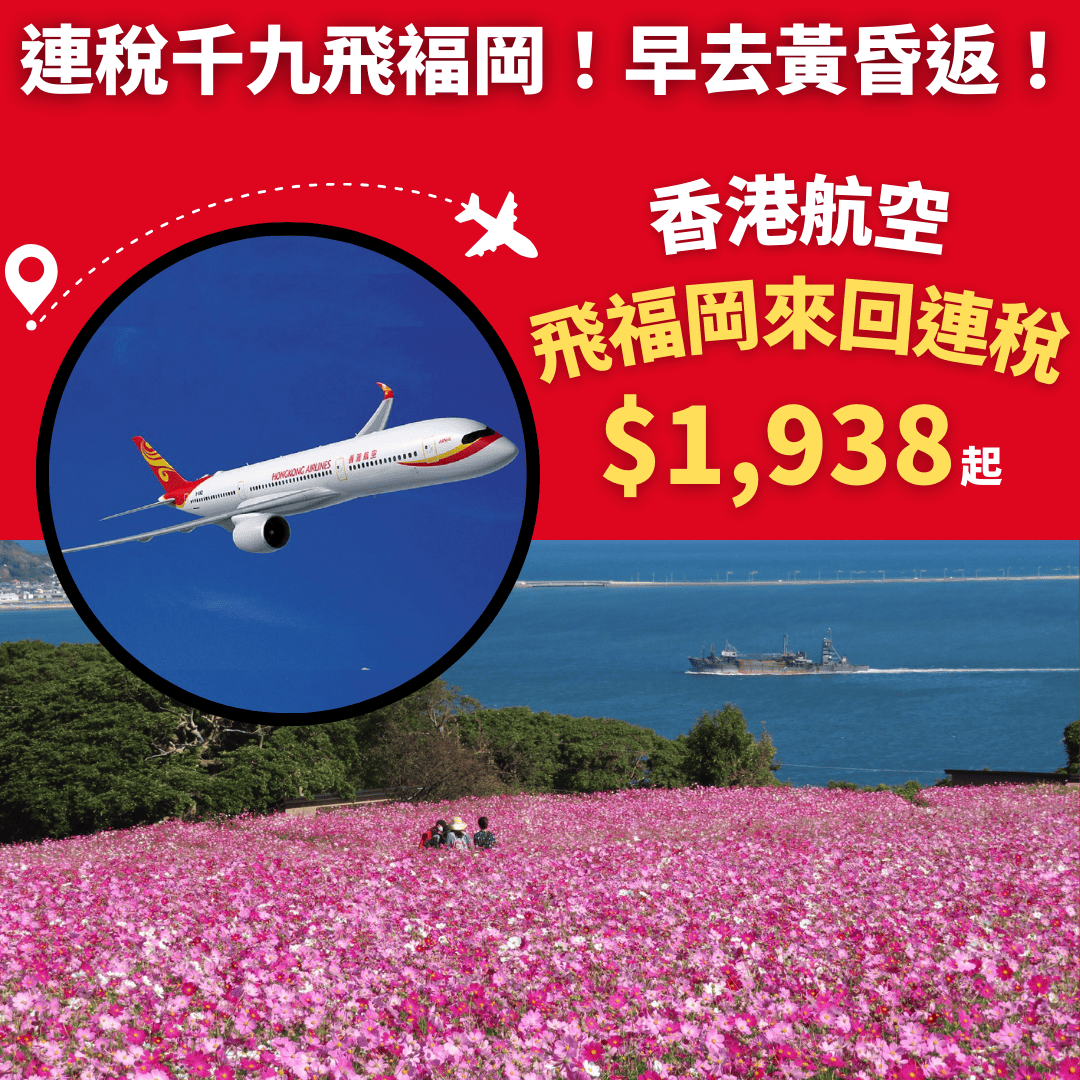 香港直飛福岡單程連稅只需$647起,包20kg寄艙行李連稅$784起!