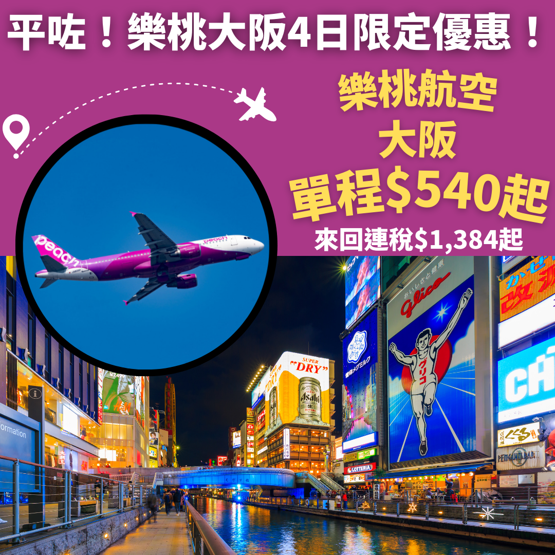 樂桃Black Friday Sale!連稅千二飛大阪!明年3月18日前出發!香港飛大阪單程只需$400起 (不收燃油附加費) – 樂桃航空 (優惠至12月1日)