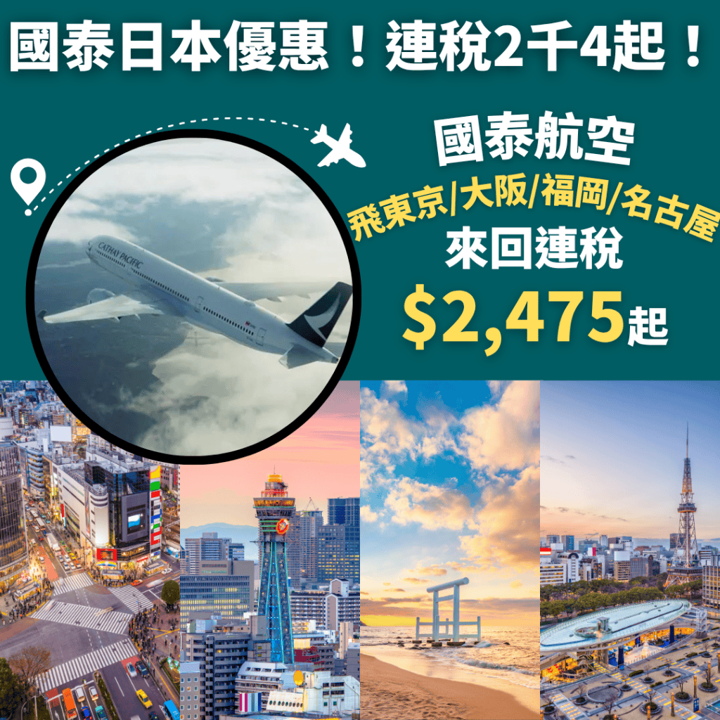 國泰航空官網:https://www.cathaypacific.com/cx/zh_HK.html (來回連稅:福岡$2,688起、大阪$2,694起、名古屋$2,723起、東京成田$2,740起,另有滙豐信用卡連稅滿$3,000減$300優惠編號:HSBC300)