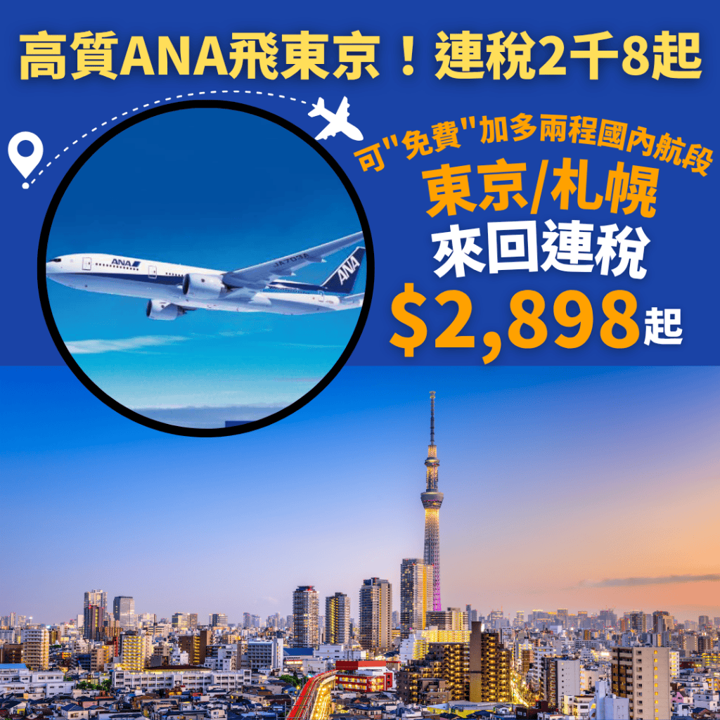 高質ANA飛東京!連稅2千7起!明年2月份出發!可”免費”加多兩程國內航段!香港飛東京來回連稅只需$2,727起、札幌$2,812起 – ANA全日空 (優惠至11月30日)