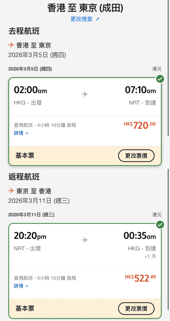 提提大家,搜尋後所顯示嘅機票價錢係已連稅,去程連稅$688起,回程連稅$490起就係今次優惠)