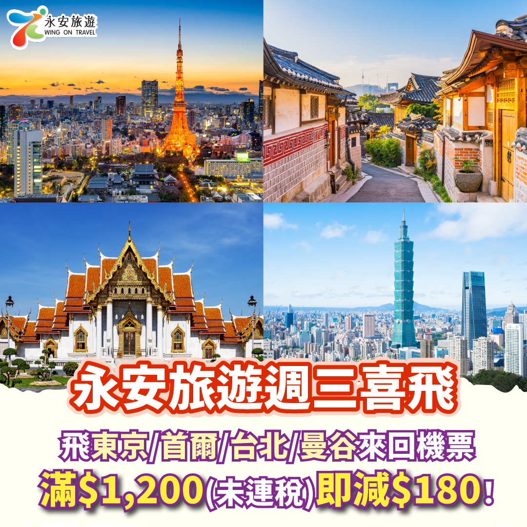 永安旅遊:https://flights.wingontravel.com (滙豐信用卡未連稅滿$1,800減$180推廣碼:HSBC180T,減$180後,來回連稅$3,720起)