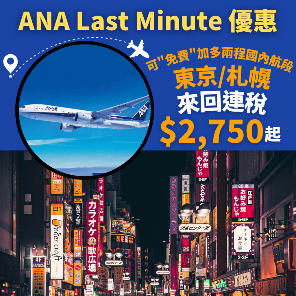 高質ANA Last Minute優惠!連稅2千7起!12月31日前出發!可”免費”加多兩程國內航段!香港飛東京來回連稅只需$2,750起 – ANA全日空 (優惠至11月3日)