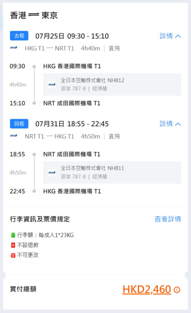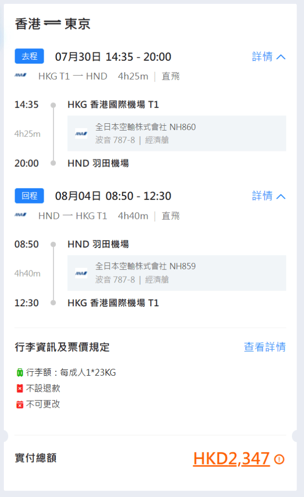 香港飛東京羽田來回連稅只需$2,347起、東京成田$2,460起