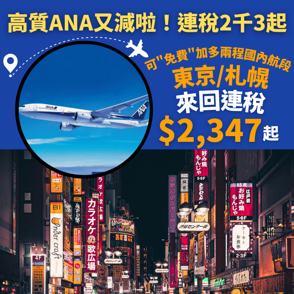 高質ANA又双叒叕敪減啦!連稅2千3起!暑假旺季都有平!明年9月30日前出發!可”免費”加多兩程國內航段!香港飛東京來回連稅只需$2,347起、札幌$2,372起 – ANA全日空 (優惠至11月11日)