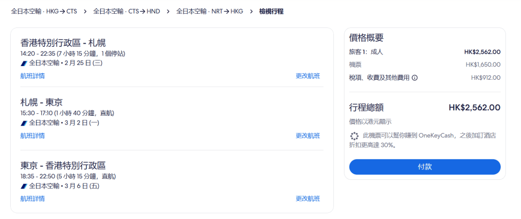 以2月25日香港經東京羽田飛札幌,3月2日札幌飛東京羽田,3月6日東京成田飛香港,來回連稅$2,562