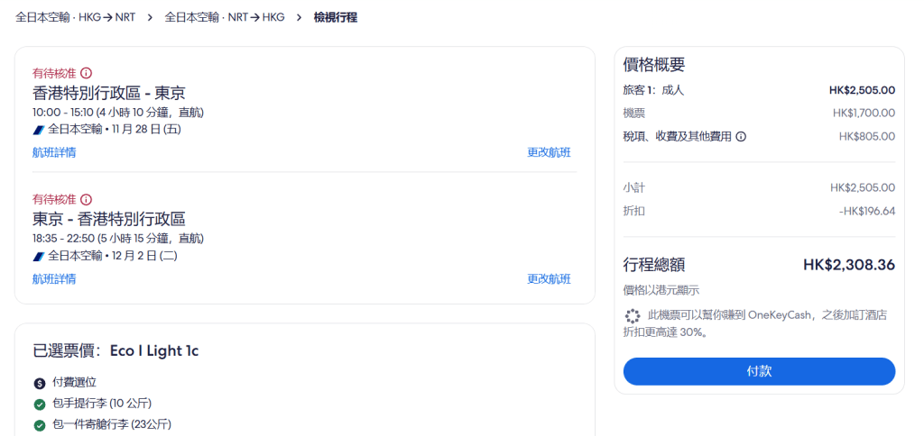 以11月28日出發,12月2日返回為列,香港飛東京成田來回連稅$2,309