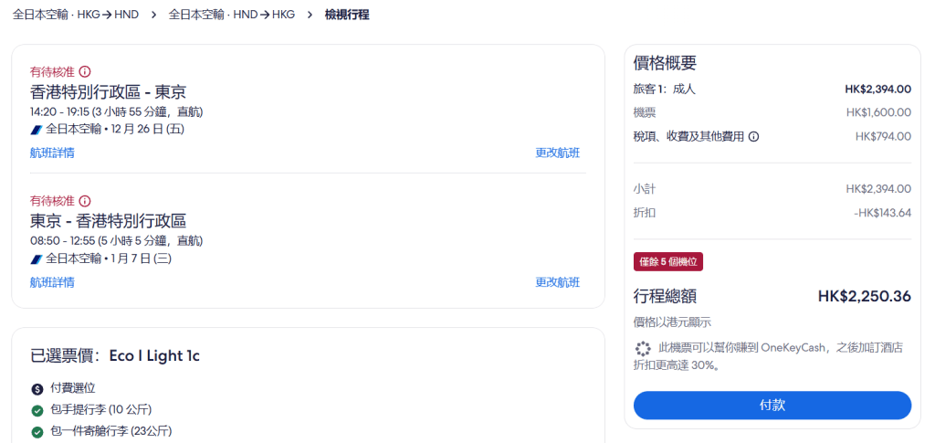 以12月26日出發,1月7日返回為列,香港飛東京羽田(午機去早機返)來回連稅$2,250