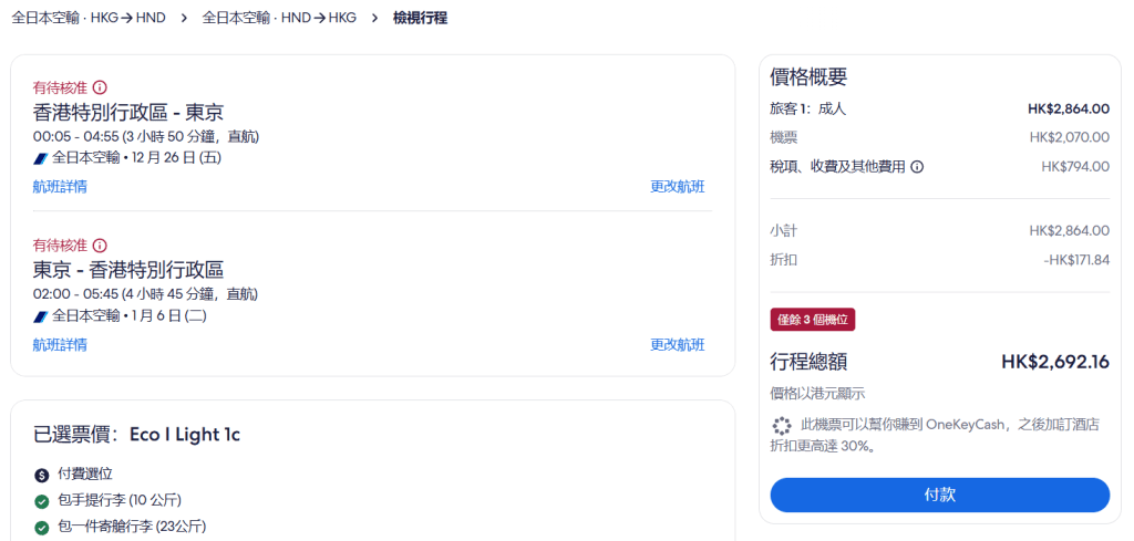 以12月26日出發,1月6日返回為列,香港飛東京羽田(凌晨機去凌晨機返)來回連稅$2,692