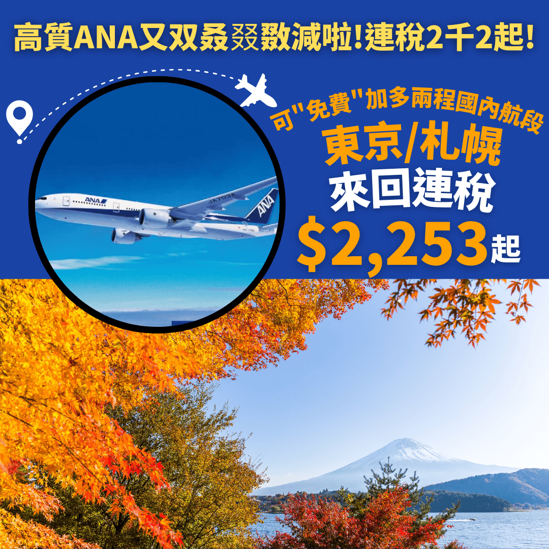 嘩!高質ANA又双叒叕敪減啦!連稅2千2起!凌晨機都有優惠!可”免費”加多兩程國內航段!明年5月31日前出發!香港飛東京來回連稅只需$2,251起、札幌$2,334起 – ANA全日空 (優惠至9月9日)